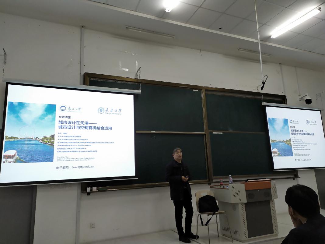 陈天首先从我国城市设计管理机制的角度,介绍了中国规划与城市设计理论模式变迁、城市设计在我国规划体系中的地位及作用,以及城市设计中存在的问题,他以天津市城市设计发展为背景,阐述了天津城市设计发展进程。在天津城市设计体系的介绍中,陈天讲解了其建立背景、体系内容、一控规·两导则、城市设计管理等方面,并着重讲解了天津城市设计的经典案例。