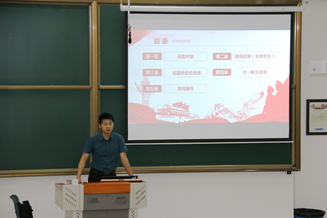 其后,刘诚悦结合2019年学校征兵工作的具体政策进行深入解读,着重针对通用政策、应届毕业生政策、大一新生政策等进行分析,帮助学生透彻理解征兵政策,鼓励学生踊跃参军。