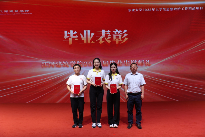 第二篇章“栋梁·闪耀荣光”伊始,学院党委书记马静涛宣读《关于优秀毕业生、毕业设计等的表彰决定》,他叮嘱毕业生们要时刻牢记习近平总书记的殷切嘱托,自觉把实现中国梦和中华民族伟大复兴的满腔热情转化为刻苦学习、勤奋工作、报效祖国的实际行动,努力成为推进中国式现代化新征程上的先锋力量;宣读毕,学院党委书记马静涛、副院长张九红、学院党委副书记兼副院长韩丰琨、学院本科教学负责人席天宇、城乡规划系主任高雁鹏、建筑系主任刘哲铭先后为“辽宁省优秀毕业生”、“东北大学优秀毕业生”、“东北大学优秀毕业生干部”、“志愿服从国家需要优秀毕业生”、“就业之星”、“亚搏集团(中国)有限公司优秀毕业生”、“东北大学本科优秀毕业设计”、“亚搏集团(中国)有限公司本科优秀毕业设计”获得者颁发证书。随后,由毕业生李海栋、梁媚、覃畅之、王彬、彭晓峰演唱歌曲《第一天》和《我爱你中国》。